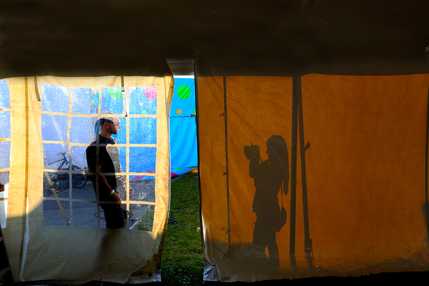 This was at the Lobster Festival in Rockland. I saw the couple outside of the tent taking turns shooting each others picture so I asked them if they would mind if I took a picture of the young woman taking a picture of her boyfriend. I had first noticed the wonderful light creating silhouettes from others walking by and the wonderful squares (shapes) that were backlit.
