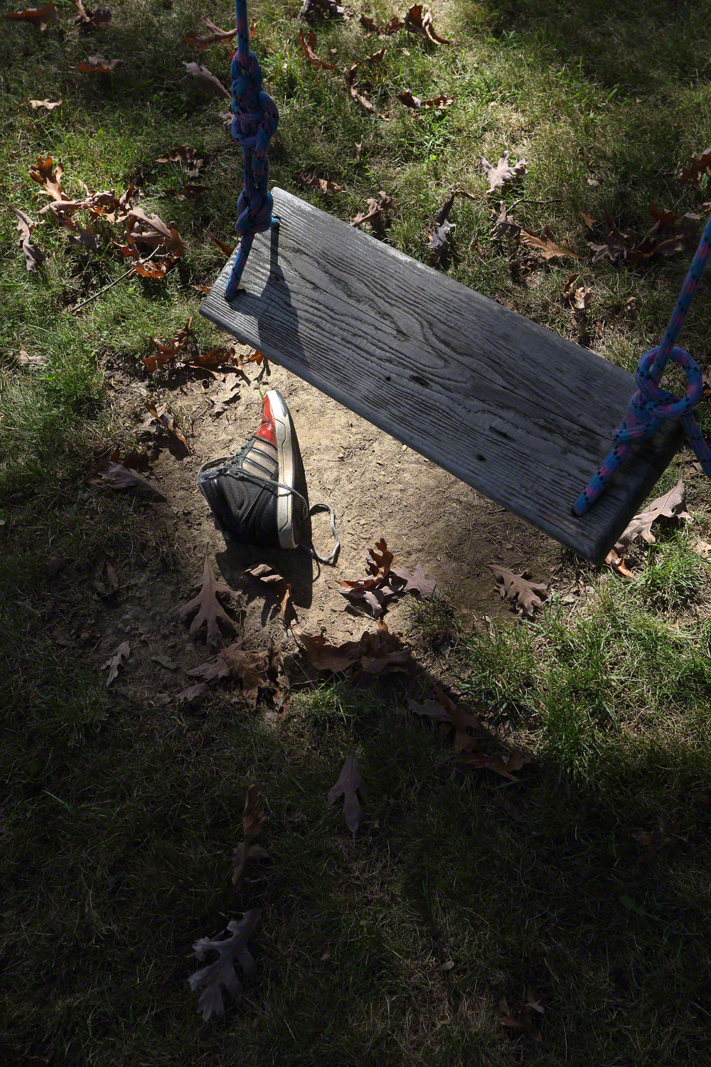 When you look at the swing by itself, you’re looking at a fairly interesting image mostly as a result of the dramatic way it’s backlit, the texture of the grass, the leaves, and the shadow.