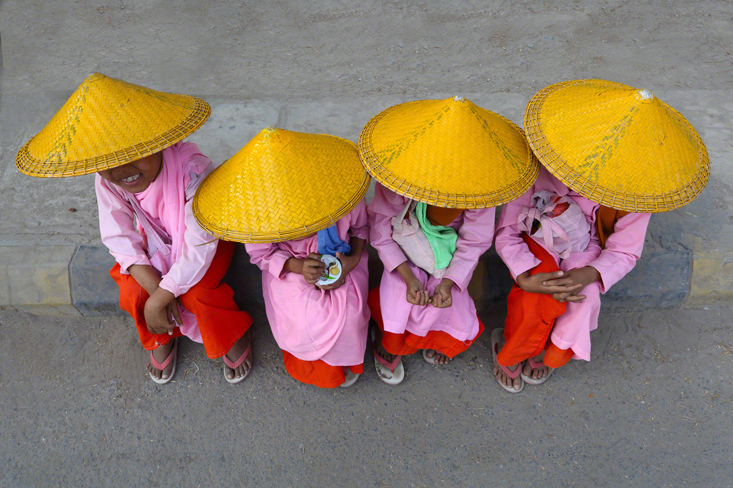 The above photo was taken while I was conducting a workshop in Myanmar. Our guide had these small girls that were about to go in a convent to become nuns pose for my fellow photographers. They all had fun taking various portraits of individual girls and as a group. When they were all done I asked our guide to have them sit next to each other on the curb. I put on my 17-40mm Canon lens and stood on my tiptoes above them.