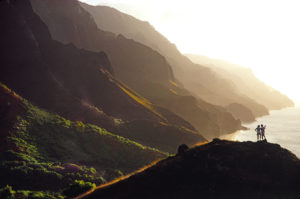 In the photo of the couple standing on a small hill in Hawaii, I was hovering in a helicopter and was communicating with them by way of a walki-talki in the chopper and one on the man’s belt on the right. The object was to create negative space so all of their arms and legs would be well defined; by directing them with the walki-talkis.