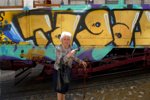 I was leading my workshop in Lisbon and as usual we were walking aound the “City of Seven Hills”. I came upon this graffiti covered streetcar and because of the color and all the people walking up the hill, I decided to wait.