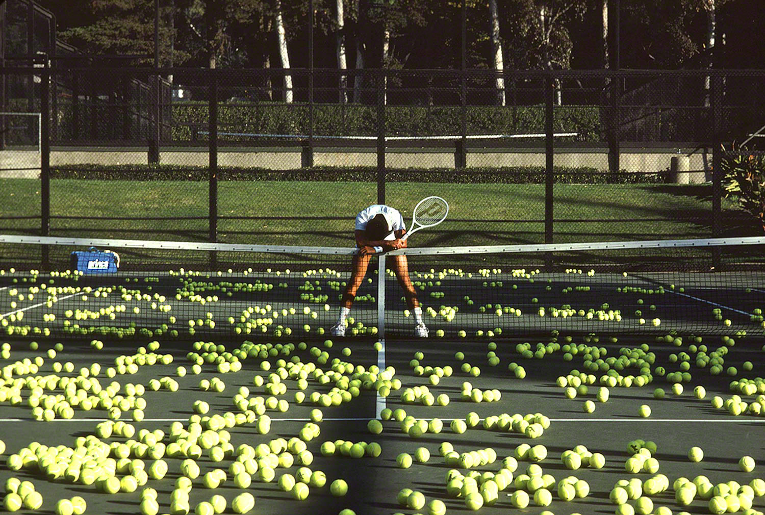 This is what people look like when they’re taping tennis balls to the court.