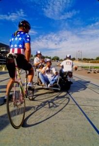 In the above photo, I was shooting an ad for the agency that handled Microsoft. The Art Director wanted me to shoot a photo that would say that their client was a “Leader of the pack”. I came up with different scenarios and he liked the idea of a biker winning a bike race. After scouting several locations, based on the sunset readings from my hand bearing compass, we choose the Velodrome in LA. He also said that he wanted a grainy and gritty look to it with a feel of movement. BTW, the movement came from shooting at various shutter speeds.