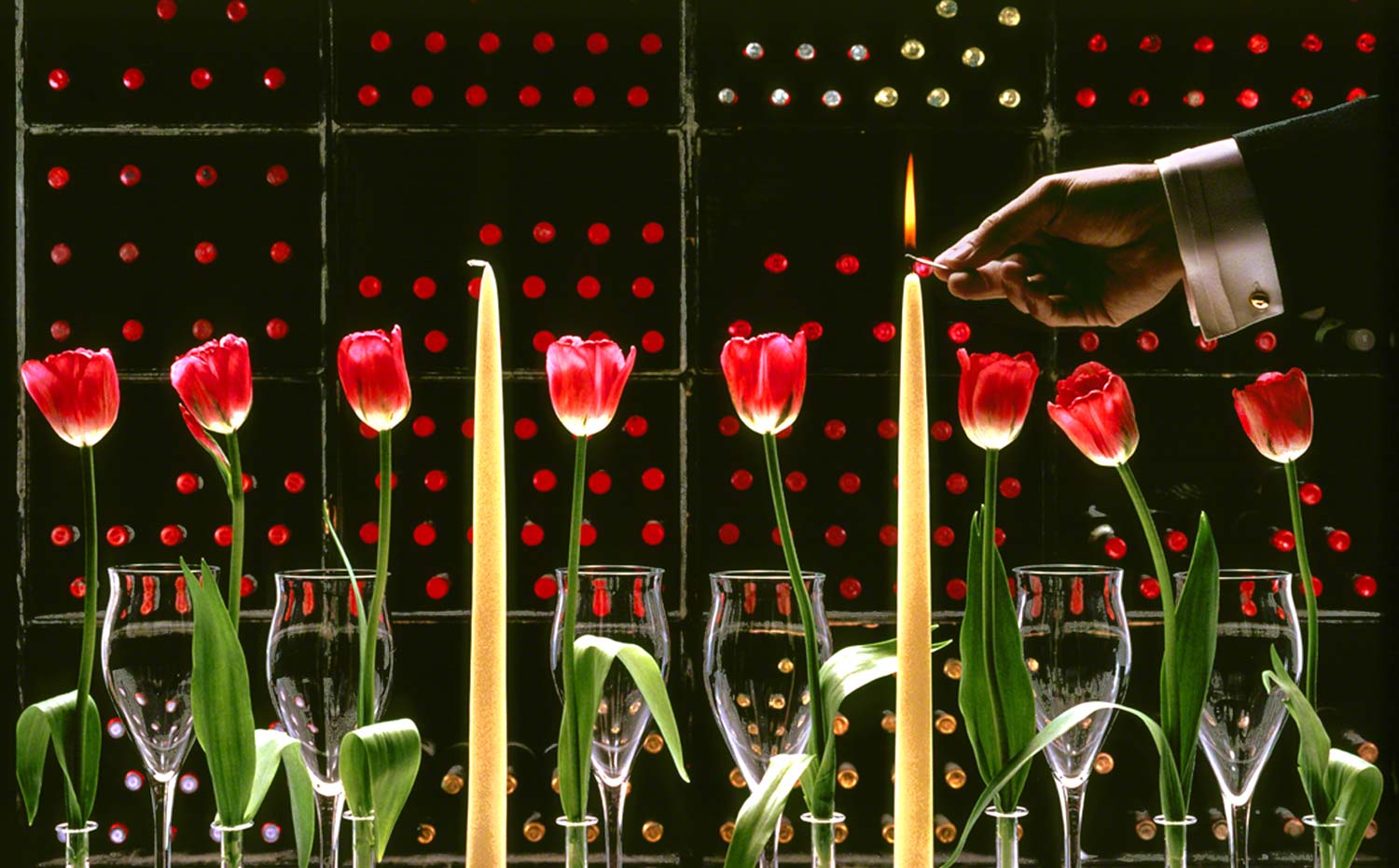 I created this photo in the wine cellar of a well known restaurant in the area. With the bottles of wine in the background, I set up a table and arranged the wine glasses and tulips from edge to edge. That was the easy part. I wanted to show a hand coming into the frame lighting one of the candles. Trying to open the shutter and exposing for the table setting and then having the hand light the candle proved to be impossible. I just couldn’t get the flame to stand up and look delicate. Remember that this was before the days of Photoshop, where it would now be soooooooo easy to create it on the computer.