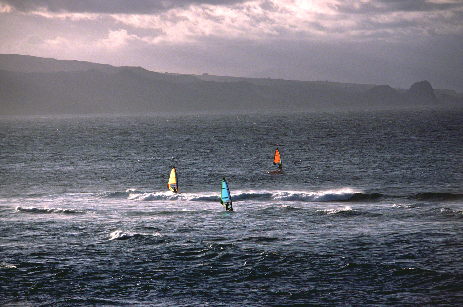 We arrived in the afternoon, and on that day it was overcast; rare for Maui. We had just this one afternoon off, so I couldn’t spend more than a few hours…so we waited, hoping for a break in the weather. I was set up on a pullout that overlooked the beach, with my 600mm Nikkor f/4 lens on, and was watching the windsurfers until there was just a handful of them left.