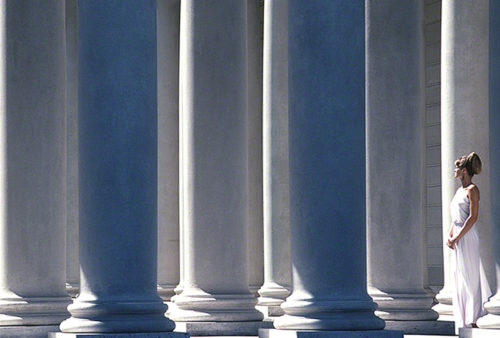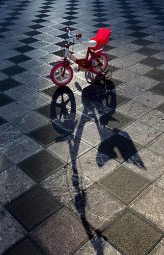 If I’m looking at railroad tracks, I see patterns created by the ties, texture created by the rocks, and a Vanishing Point I can use to move the viewer around my composition. If I’m looking at a naked baby spitting water into the fountain it’s sitting in, I imagine the possibility of creating a silhouette with backlit water spewing out of his mouth.