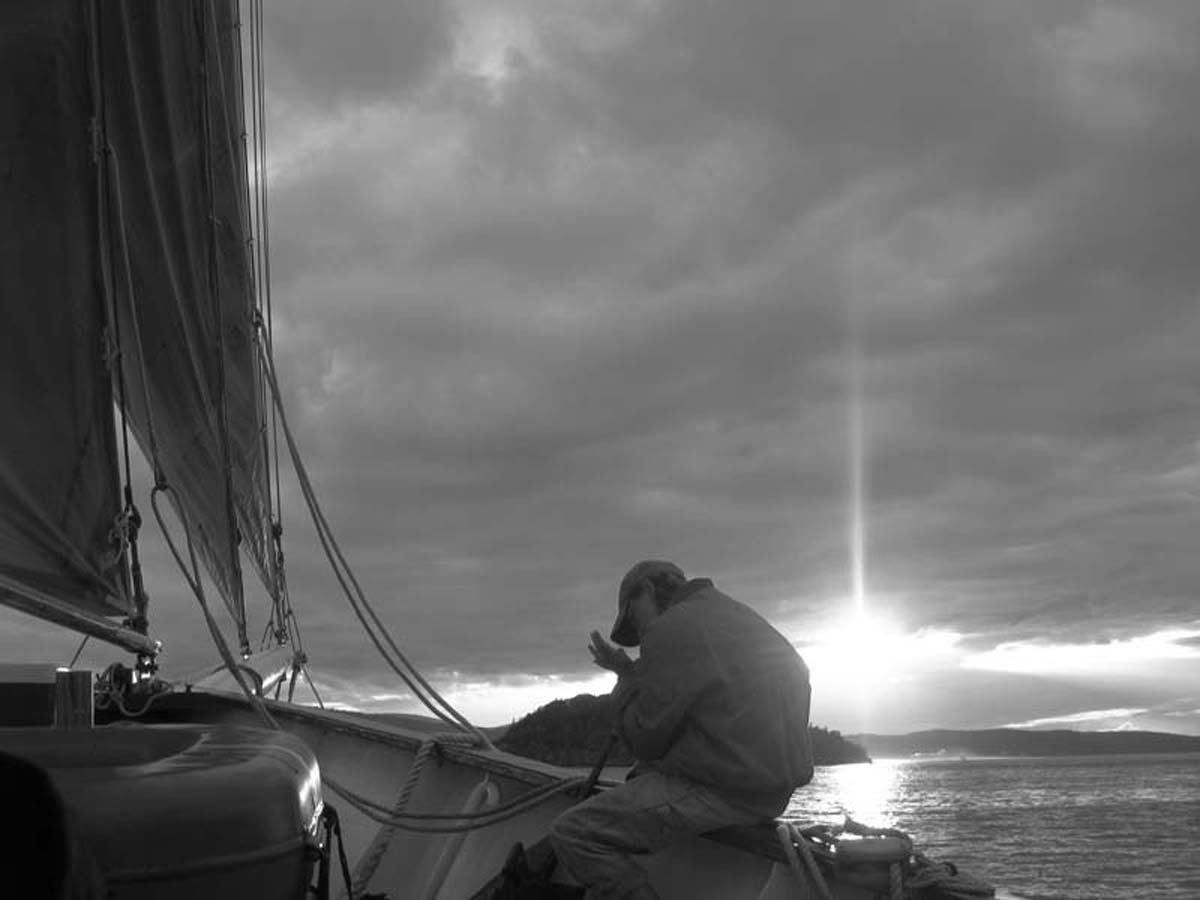 I was up in Acadia National Park a few years ago. I love to sail and we were out on this boat for a sunset cruise. I captured this image and thought it was interesting how the deck hand was focused on doing something as they sat on the rail.