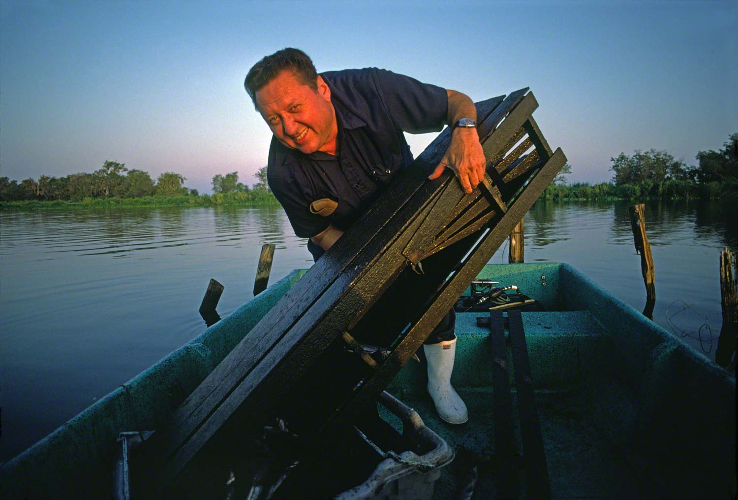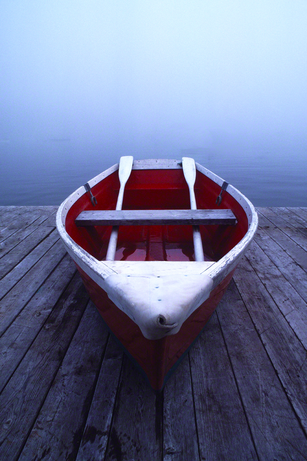 If I can’t minimize the sky on a gray day, I want to put something in it or change the way the sky looks. You have to take control of how the viewer is going to perceive the morning. Make sure it won’t matter to him by making an overcast day work for you. In this photo, of the two men standing in the boat, I broke up the foggy, overcast sky into four sections and created an ‘X’ to do it with.