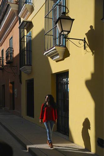 In the photo to the left, I had the woman walk through my frame. I set my camera on continuous and when she approach the mark (the small area of light), I started shooting. In order to hit the mark, and at the right exposure, I stood her in the spot I wanted and took a couple of shots to determine what I was after as far as being a little underexposed. Once I determined the right look, I backed her up and began the process.
