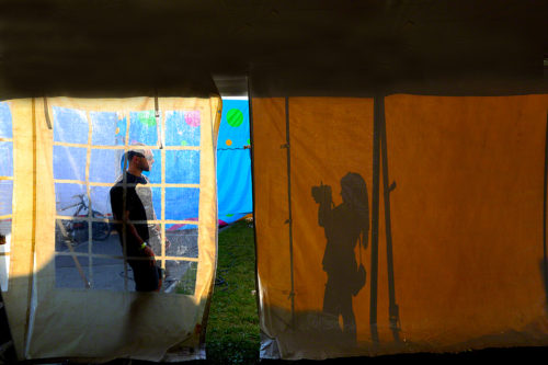 In the above photo, I was walking inside this tent at a festival and saw these two people right outside it. I was an interesting shot, filled with visual interest., The guy was moving around for her and for the most part, the lines forming the windows were always going right through his eyes.
