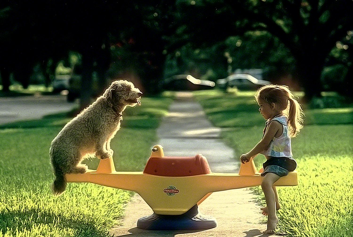 What if the kid being licked is a freckled-face darling little girl, wearing a white lace dress with bows tied around her pigtails while behind or next to them is a bunch of dirty, huge, hard hat wearing constructions workers sitting around having lunch? Then you have a dichotomy, and that would give the photo a different meaning…why you ask?