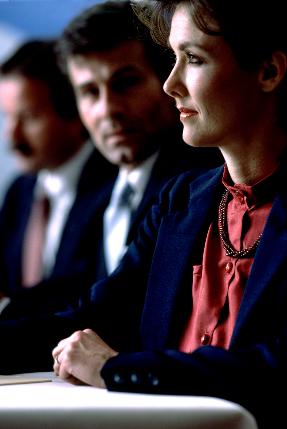 Now having the light readings the same, I then could control my DOF. I could have all three in focus, just the man in the middle, or the man on the left end. In this situation, the woman was the key executive, and the one the company wanted to feature in their annual report to the stockholders.